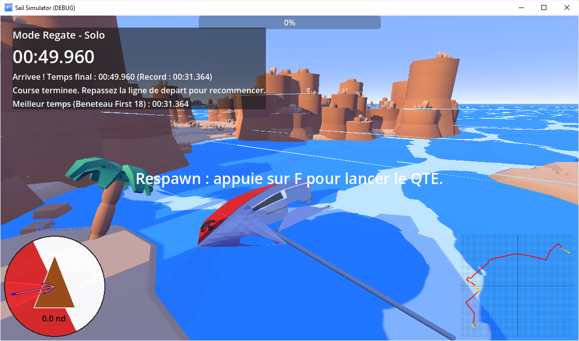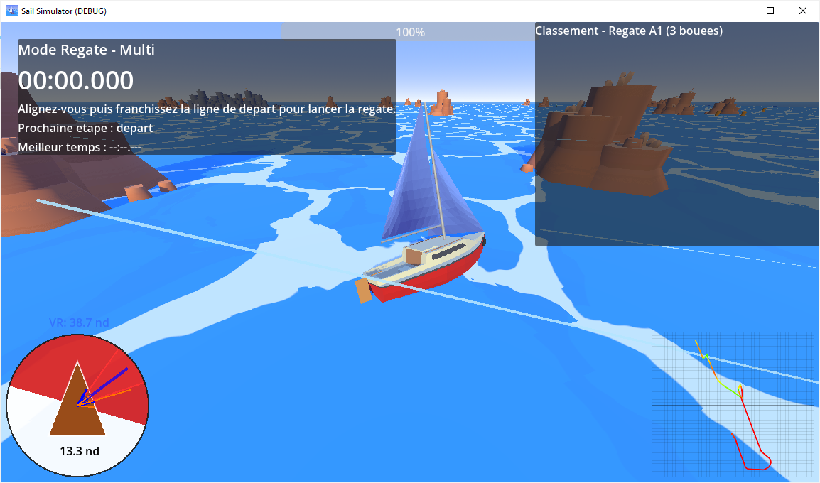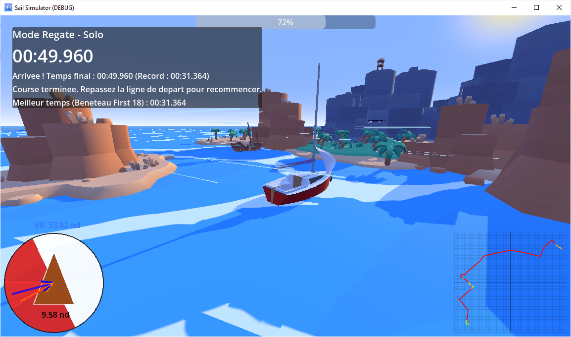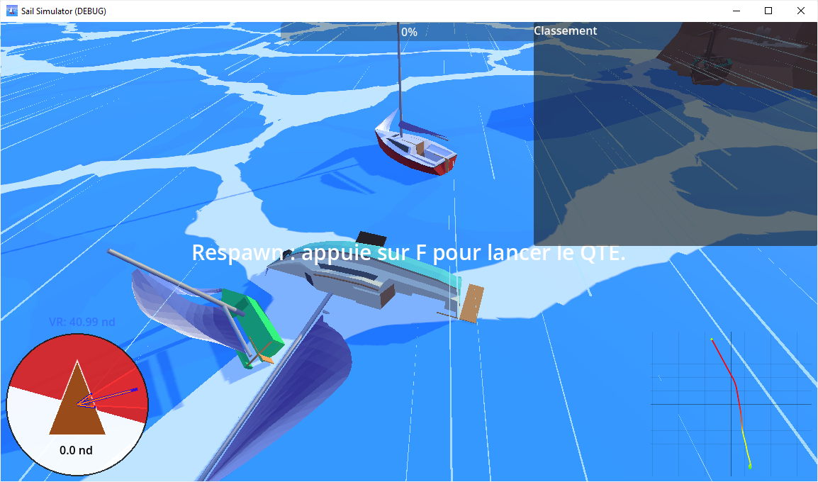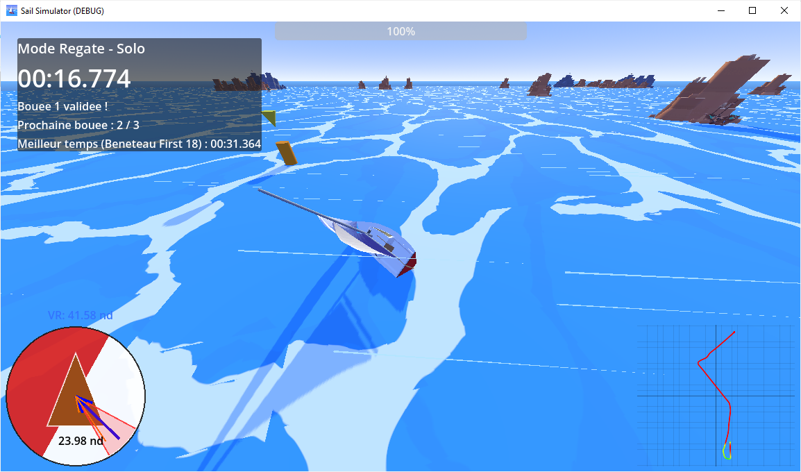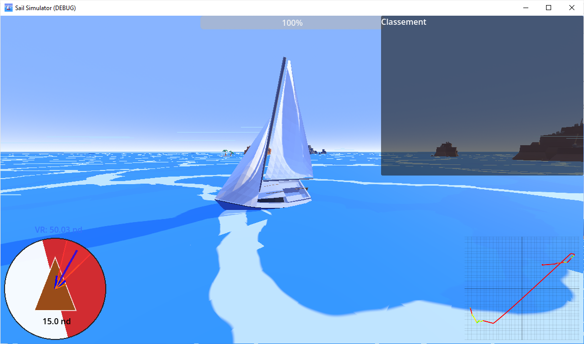 I must admit that simplifying the real physics of a boat — combining hydrostatics, dynamics, and aerodynamics (sailing upwind) — has been a challenge, and still is! I need to refine the boat itself, because even though what’s displayed is just a cube, under the hood the engine actually takes into account the waterline, the hull length, the sail efficiency, etc.